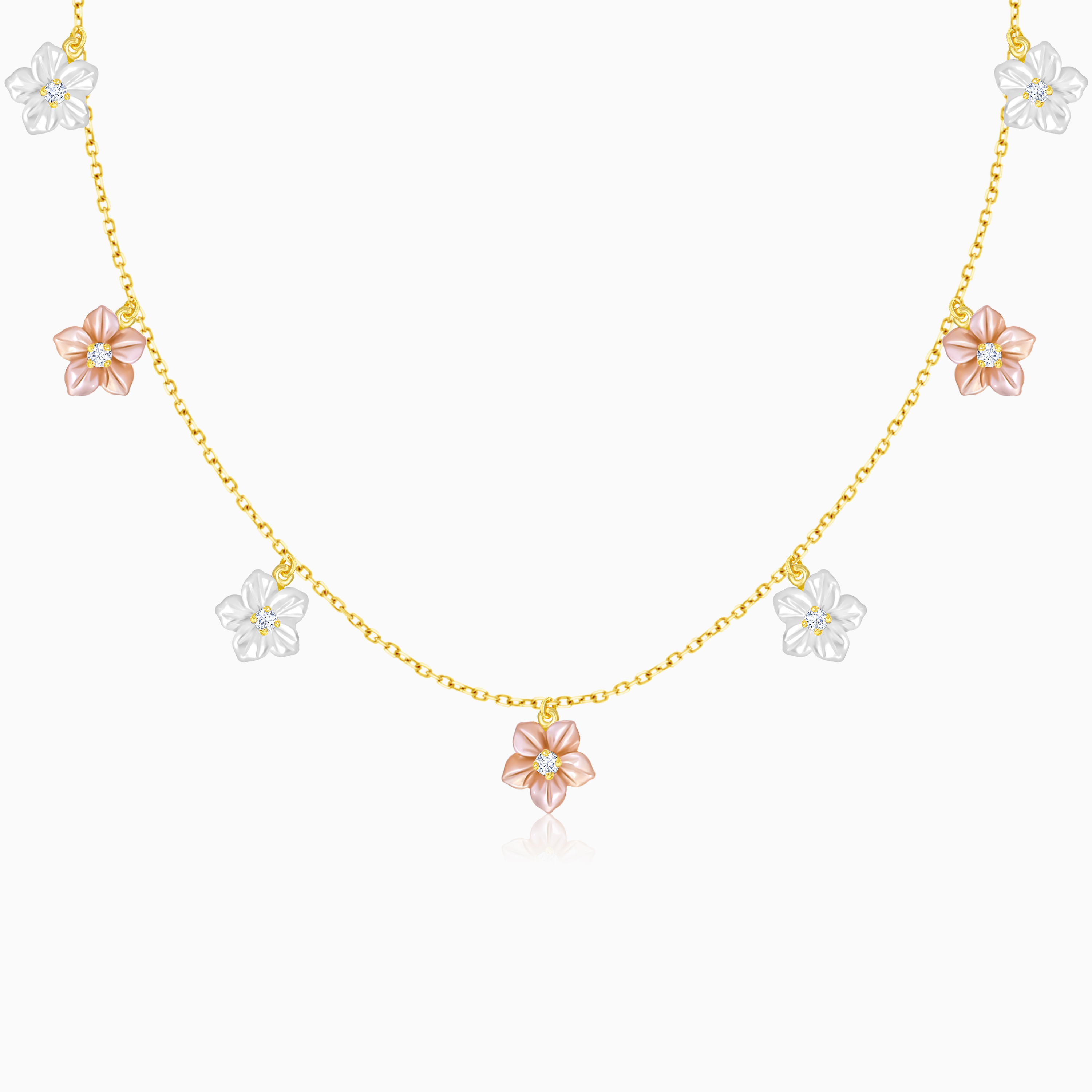 18K Worood Gold Necklace with Pink & White Mother of Pearl Flower Design and Zircon Stones – Worood Collection