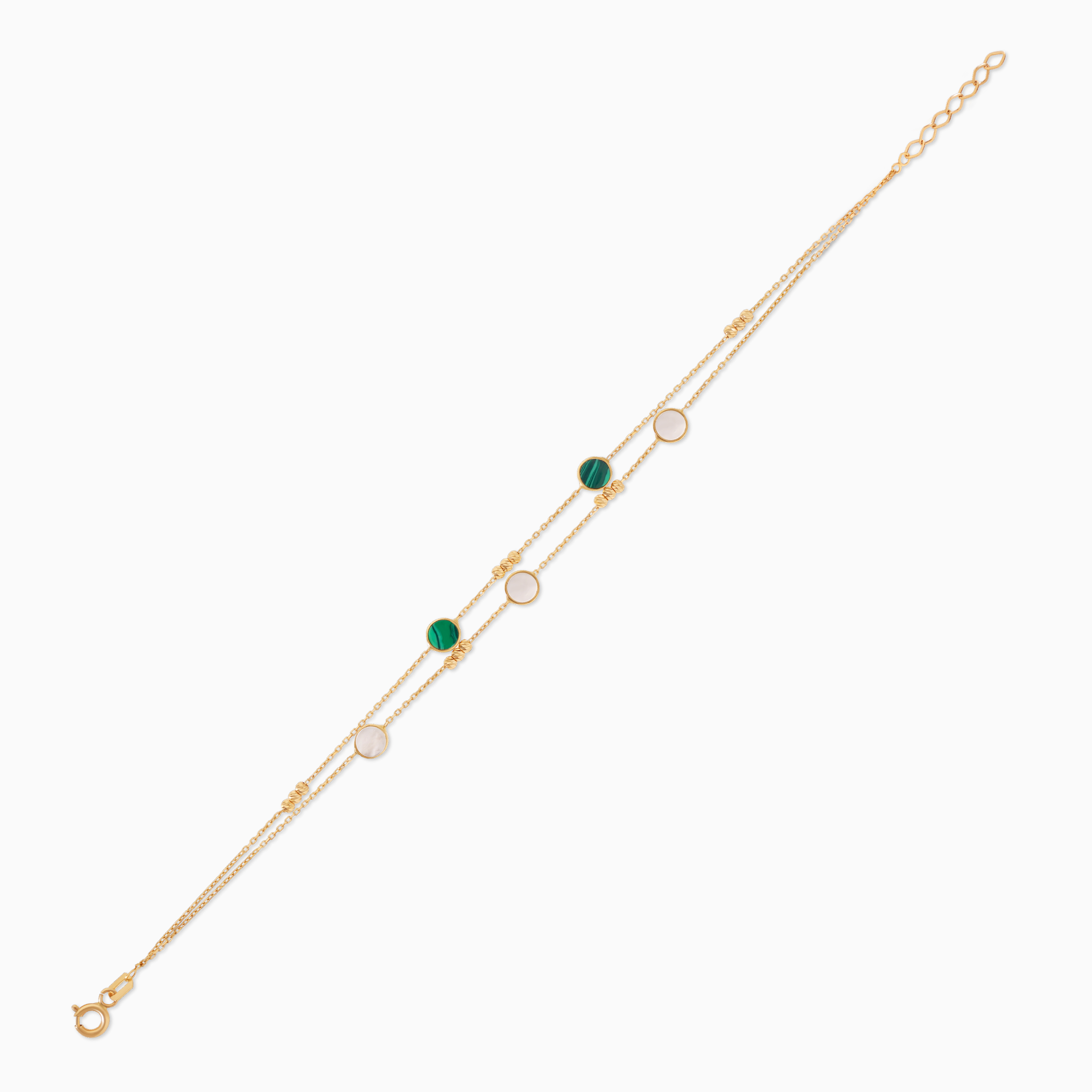 Elevate your jewellery collection with this exquisite 18K yellow gold bracelet from the Eclat Collection, featuring an elegant two-layer design of round motifs beautifully adorned with mother of pearl and malachite stones. Perfectly crafted to reflect refined taste and vibrant sophistication, this bracelet is an ideal accessory for both everyday wear and special occasions.