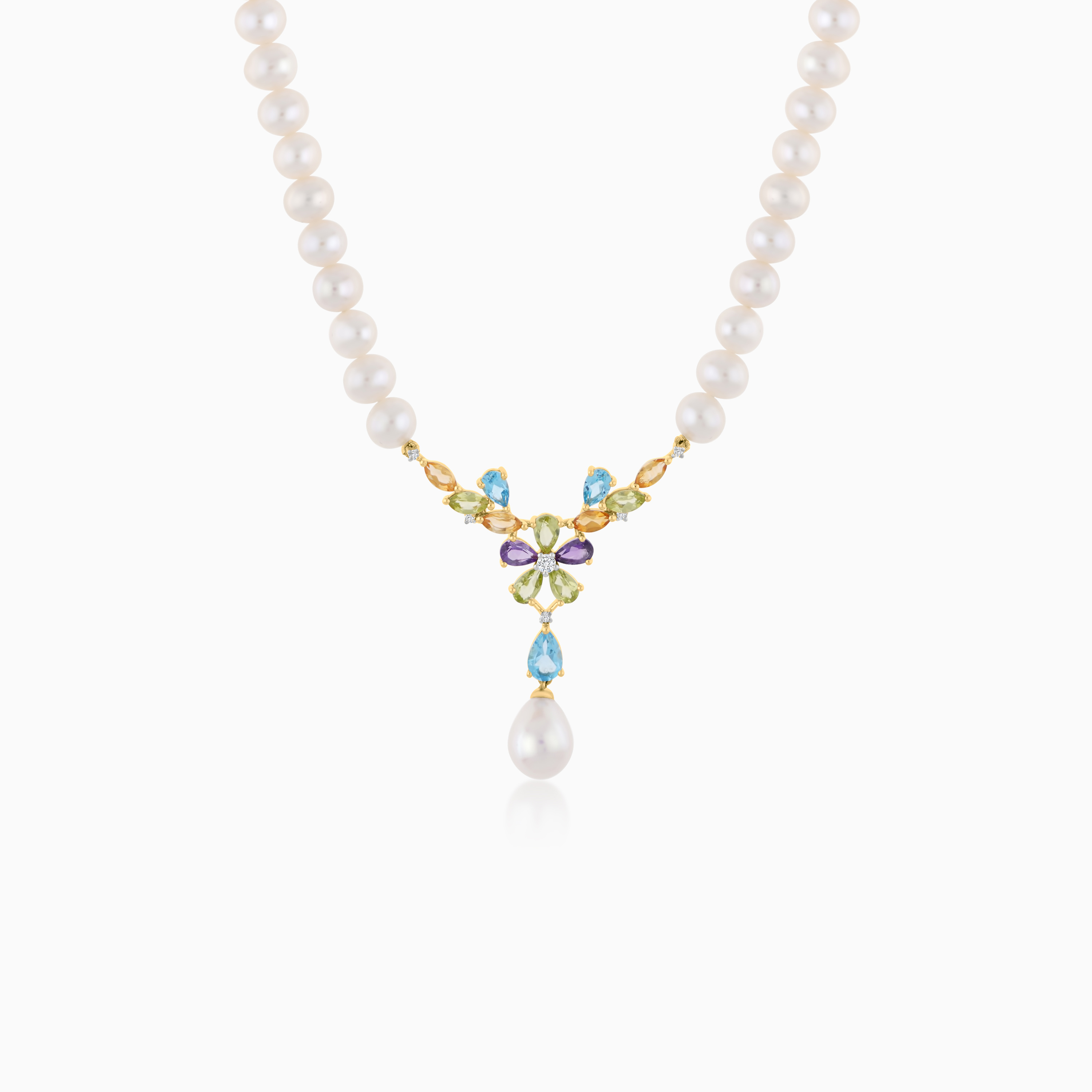 Discover refined beauty with this 18K Yellow Gold Pearl Necklace from the Danah Photopendant Collection. At its heart lies a delicate flower-shaped pendant, meticulously crafted and embellished with natural diamonds and radiant multicolour gemstones. The lustrous pearls bring a classic charm, while the intricate floral design adds a contemporary flair that captures attention.